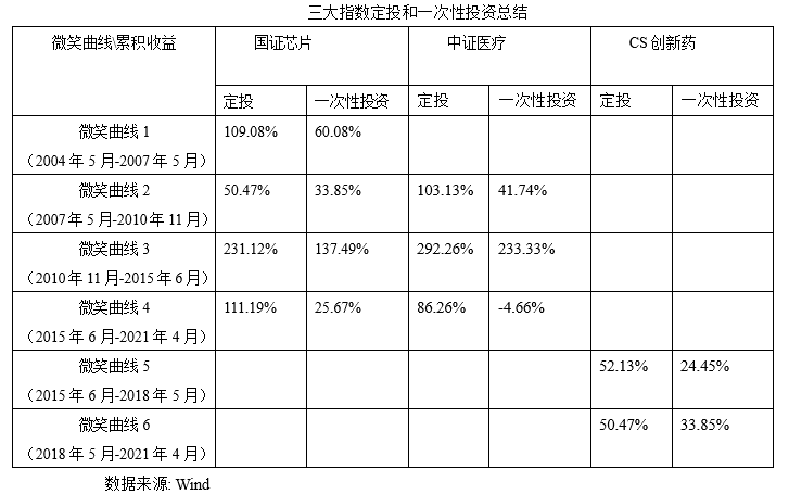 结合上图和上表的信息,对于第二个微笑曲线,投资起止时点指数的点位较为相近,投资期间指数下跌幅度足够大,微笑曲线较完美,定投的收益率接近一次性投资的2倍,表现远远优于一次性投资。第一、三、四个微笑曲线在投资后期都出现了较大幅的单边上涨,定投的优势被稍微削弱,但收益仍明显超过一次性投资。在这四轮投资中,定投的年化收益率都超过20%,最高时甚至接近140%,表现不可谓不亮眼,且在投资期间定投的最大亏损远小于一次性投资,定投的优势得到充分体现。