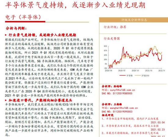 另外,华安证券亦发布研报指出,半导体产能越发重要,IDM和代工,以及半导体材料板块2021年上半年业绩确定性高,且景气度有望持续全年。