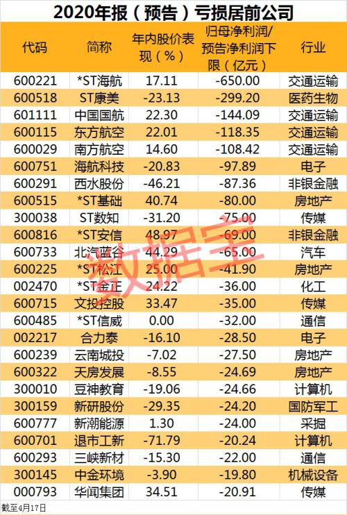 紧随其后是ST康美近300亿元亏损。中国国航、东方航空和南方航空均公布了亏损超百亿元的2020年报。