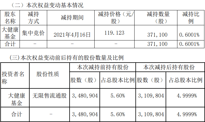 根据公告,大健康基金4月16日的减持价格为119.123元/股,接近当天涨停价,当日套现4420万元。以最新收盘价计算,大健康基金所持剩余股份市值约3.74亿元。