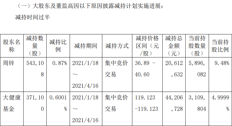 与大健康基金同步预告减持的董事周锌也没踩准步点。他的减持价格,在36.89—40.6元之间。当然,周锌手中剩余的持股数量较多,称不上踏空。