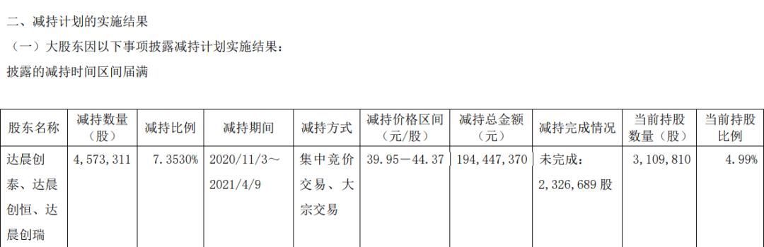达晨创泰、达晨创恒及达晨创瑞合计持有热景生物12.35%的股份,计划6个月内减持不超过11.094%的股份。截至今年4月9日(上周五),减持期限届满,达晨创泰、达晨创恒及达晨创瑞共减持了7.3530%的股份,减持价格区间仅39.95—44.37元之间。