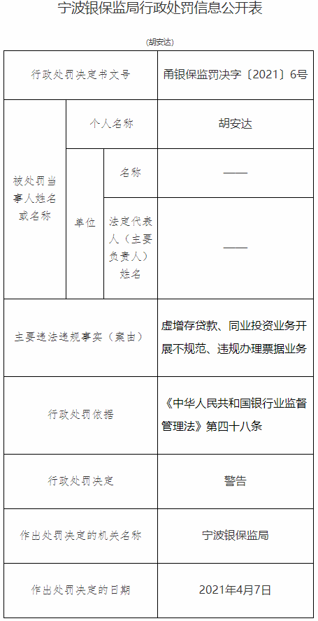 胡安达为广发银行宁波分行虚增存贷款、同业投资业务开展不规范、违规办理票据业务的相关责任人。根据《中华人民共和国银行业监督管理法》第四十八条,宁波银保监局对其警告。