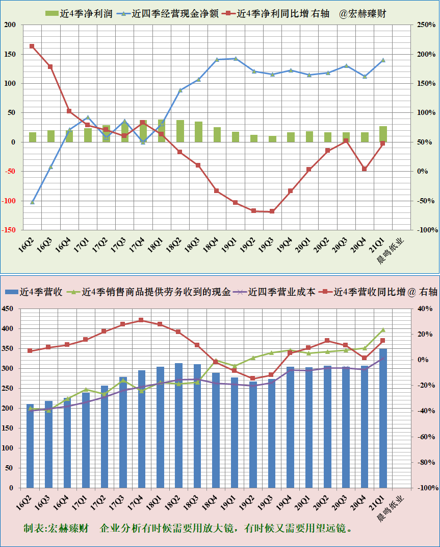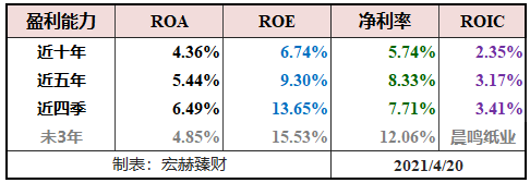 2021Q1公司营收增速较好,白卡纸方面,在清退白板纸产能、禁废令和限塑令加码的背景下,白卡纸有大量来自灰底白板纸和不可降解塑料的替代需求;文化纸方面,建党100周年的增量需求较大。