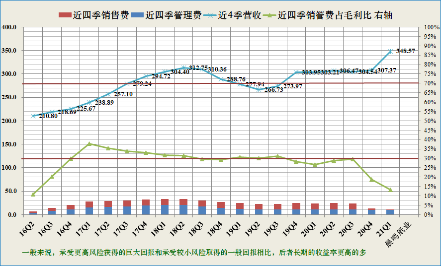 晨鸣纸业该指标逐步趋优,公司自2018年起近四季销管费占毛利比指标处于优秀线位置附近波动,整体在19Q4后进入优秀区间。获利性强。