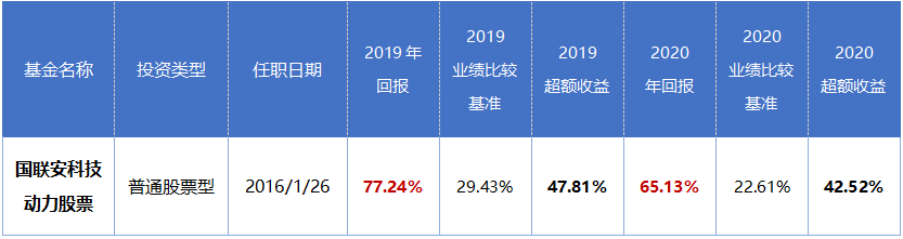 国联安科技动力股票成立于2016.1.26,潘明自成立之日起担任基金经理,该基金2016-2020年各年度回报分别为:-6.10%、21.24%、-38.86%、77.24%、65.13%;同期业绩比较基准分别为:5.47%、17.32%、-19.66%、29.43%、22.61%。业绩比较基准:沪深300指数*80%+上证国债指数*20%。数据来源:基金定期报告、万得资讯,截至2020.12.31。以上数据经托管行复核。