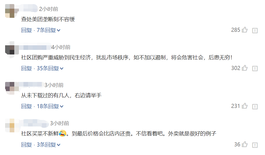 对于美团发力社区电商的举动,看衰者也不在少数。有网友表示:“社区买菜不新鲜,到最后价格会比店内还贵,不信看着吧,外卖就是很好的例子。”