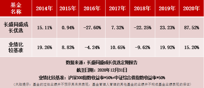 长盛同盛成长优选2014年、2015年、2016年、2017年、2018年、2019年、2020年净值增长率分别为15.11%、0.94%、-27.60%、7.32%、-22.25%、23.23%、87.52%,同期业绩比较基准收益率分别为19.26%、8.83%、-4.24%、10.65%、-9.62%、19.92%、15.20%。数据来源:长盛同盛成长优选定期报告,统计日期:2014 年11 月 5 日至2020年12月31日,业绩比较基准:沪深300指数收益率*50%+中证综合债指数收益率*50%。