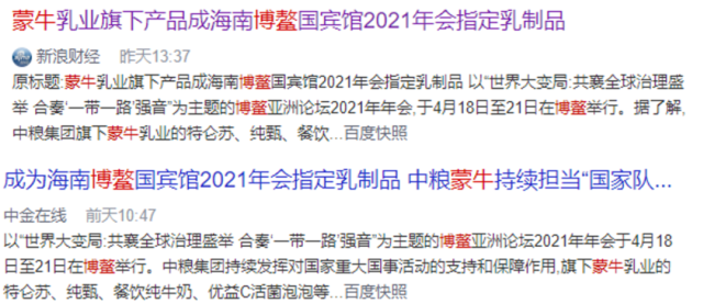 目前,网络中已经无法找到相关文章的具体内容,但据媒体的公开报道,4月19日曾有名为《蒙牛乳业旗下产品成海南博鳌国宾馆2021年会指定乳制品》、《成为海南博鳌国宾馆2021年会指定乳制品 中粮蒙牛持续担当“国家队”重任》等多个文章中提及,“中粮集团旗下蒙牛乳业的特仑苏、纯甄、餐饮纯牛奶、优益C活菌泡泡等产品成为海南博鳌国宾馆2021年会指定乳制品。”