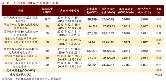 假设CCER的价格为30元/tCO2,以七个不同省的风电项目为例计算CCER项目带来的收入,计算结果为:光伏项目平均每上网1度电可增收0.026元。