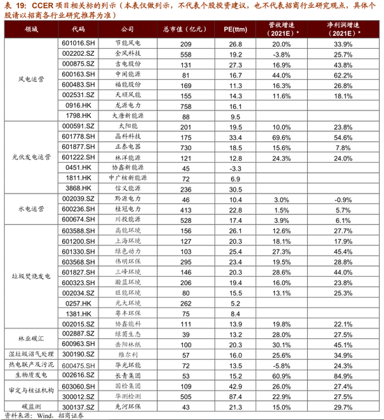 我们对一个2021年新增并网50MW风电项目做收入弹性测算。假设悲观/中性/乐观情形下,风能利用小时数分别为900/1100/1300小时,上网电价分别为0.35/0.40/0.45元/kwh,CCER碳价分别为20/30/35元/吨,1MWh电量二氧化碳减排量分别为0.7/0.8/0.9吨。经测算,一个50MW的新增并网装机项目可通过出售CCER增收63-205万元/年,约可以贡献4%-7%的收入弹性,利润弹性则有望更大。