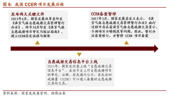 在CDM项目发展受限的情况下,我国建立了国内的自愿减排碳信用交易市场。2012年,国家发展改革委印发《温室气体自愿减排交易管理暂行办法》、《温室气体自愿减排项目审定与核证指南》两大关键文件,国内的减排项目重启在国内的注册。2015年自愿减排交易信息平台上线,CCER进入交易阶段。2017年,CCER项目备案暂停,存量的CCER交易仍在各大试点进行。