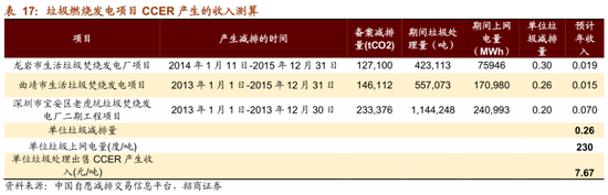 垃圾焚烧发电CCER项目收入测算。根据过往的三个垃圾焚烧发电CCER项目为例进行测算,每吨垃圾焚烧发电约能减少0.26吨的碳排放,每吨垃圾焚烧约发电230度。假设CCER的价格为30元/吨CO2,则每处理一吨垃圾将额外产生7.6元收入。