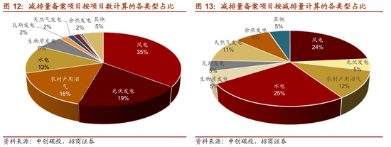 从完成备案的861个项目来看,情况和上述略有不同。按项目数计算,风电项目占据了项目总数的37.7%,光伏发电、沼气发电比例较大。按减排量计算,风电项目减排量最多,其次是水电项目,其余项目类型减排量所占比例相对均衡。