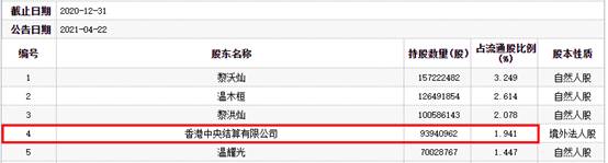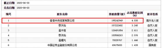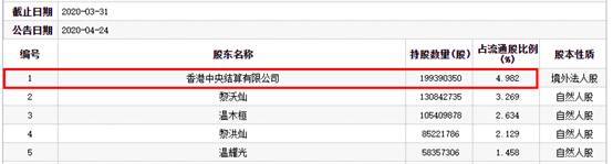2020年一季度,香港中央结算有限公司持有1.99亿股,占流通股的比例为4.982%,为温氏股份的第一大流通股东;二季度,香港中央结算有限公司持股1.95亿股,占流通股比例4.03%,仍为第一大流通股东;三季度,香港中央结算有限公司持有1.39亿股,占流通股比例2.882%,退至第二大流通股东;四季度,香港中央结算有限公司持股9394.10万股,占流通股比例1.941%,为温氏股份第四大流通股东。