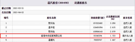 2021年一季度,香港中央结算有限公司再度减持温氏股份至8334.04万股,占流通股比例1.723%,位列第四大流通股东。