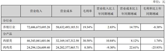 年报披露,2020年温氏股份的主营业务毛利率为19.34%,比上年同期下降了8.38个百分点。分产品来看,公司肉猪类的毛利率为30.58%,同比增长1.74个百分点,肉鸡类毛利率为0.38%,同比下降25.93个百分点。