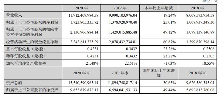 同日,爱尔眼科公布2020年年报,2020年全年营收119.12亿元,同比增长19.24%;净利润为17.24亿元,同比增长25.01%,拟10转3派1.5元。