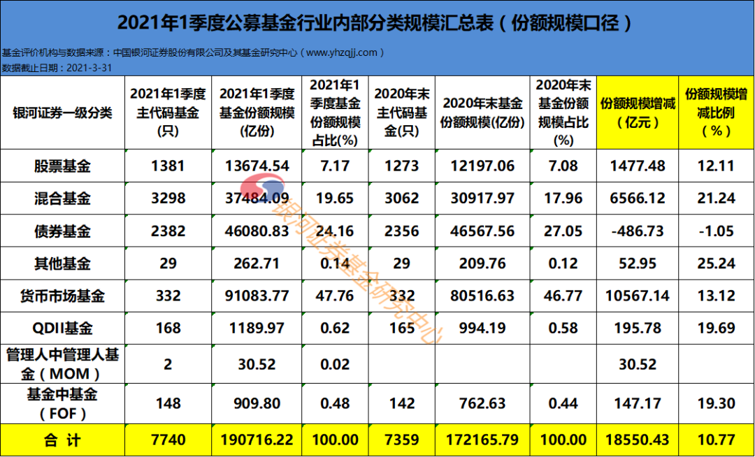 2021年1季度末各类型基金资产净值与份额规模较2020年底变化如下: