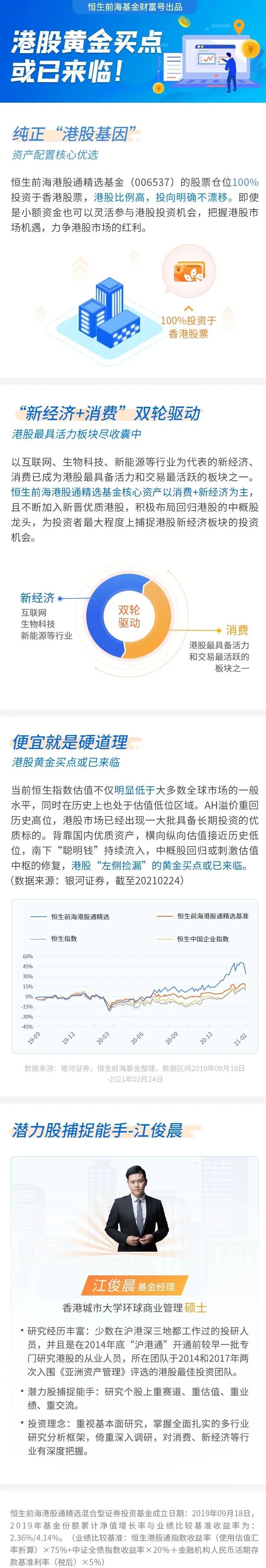 很多人可能会问,恒仔你的快乐星球是什么?那么对于恒仔来说,我的快乐星球,那当然是拥有一只好基金!为什么这么说呢,恒仔觉得投资,尤其是港股投资,对于个人而言其实是一件非常艰难的事情,当你需要面对每天市场的波动、面对每只港股无限制的涨跌幅、面对海内外各类真真假假的消息、面对自己追涨杀跌的人性弱点、面对控制不住的手的时候,你就会发现,拥有一只专业投资港股的基金,少了很多不必要的烦恼,是多么幸福的一件事!这次恒仔就带你研究研究我这只体验感十足的港基“快乐星球”——恒生前海港股通精选混合基金(006537)!