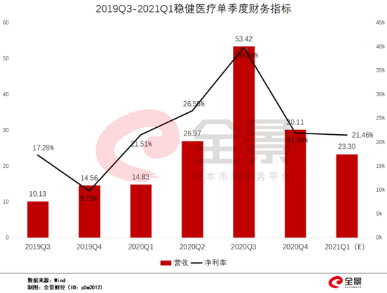稳健医疗2020年营收125亿,并实现38亿的归母净利润,同比增长接近600%,这也符合公司前期的业绩预告。上市公司同步公布2021年一季度业绩预告,预期营收22.30-23.30亿元,同比增长50.37-57.12%;归母净利润4.60-5.00亿元,同比增长44.29-56.83%。