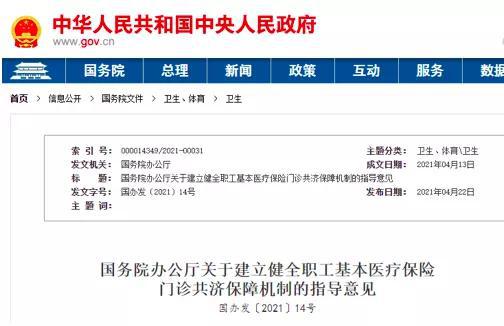 4月22日,国务院办公厅发布《关于建立健全职工基本医疗保险门诊共济保障机制的指导意见》。《指导意见》总体要求:加快医疗保障重点领域和关键环节改革,将门诊费用纳入职工医保统筹基金支付范围,改革职工医保个人账户,建立健全门诊共济保障机制,提高医保基金使用效率,逐步减轻参保人员医疗费用负担,实现制度更加公平更可持续。