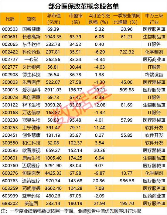 证券时报·数据宝整理了受机构关注的医保改革概念股,共24只。昨日涨幅居前的个股有爱尔眼科、迈瑞医疗、药明康德和欧普康视。从4月累计涨幅来看,美迪西、通策医疗和欧普康视3股累计涨幅均超20%。