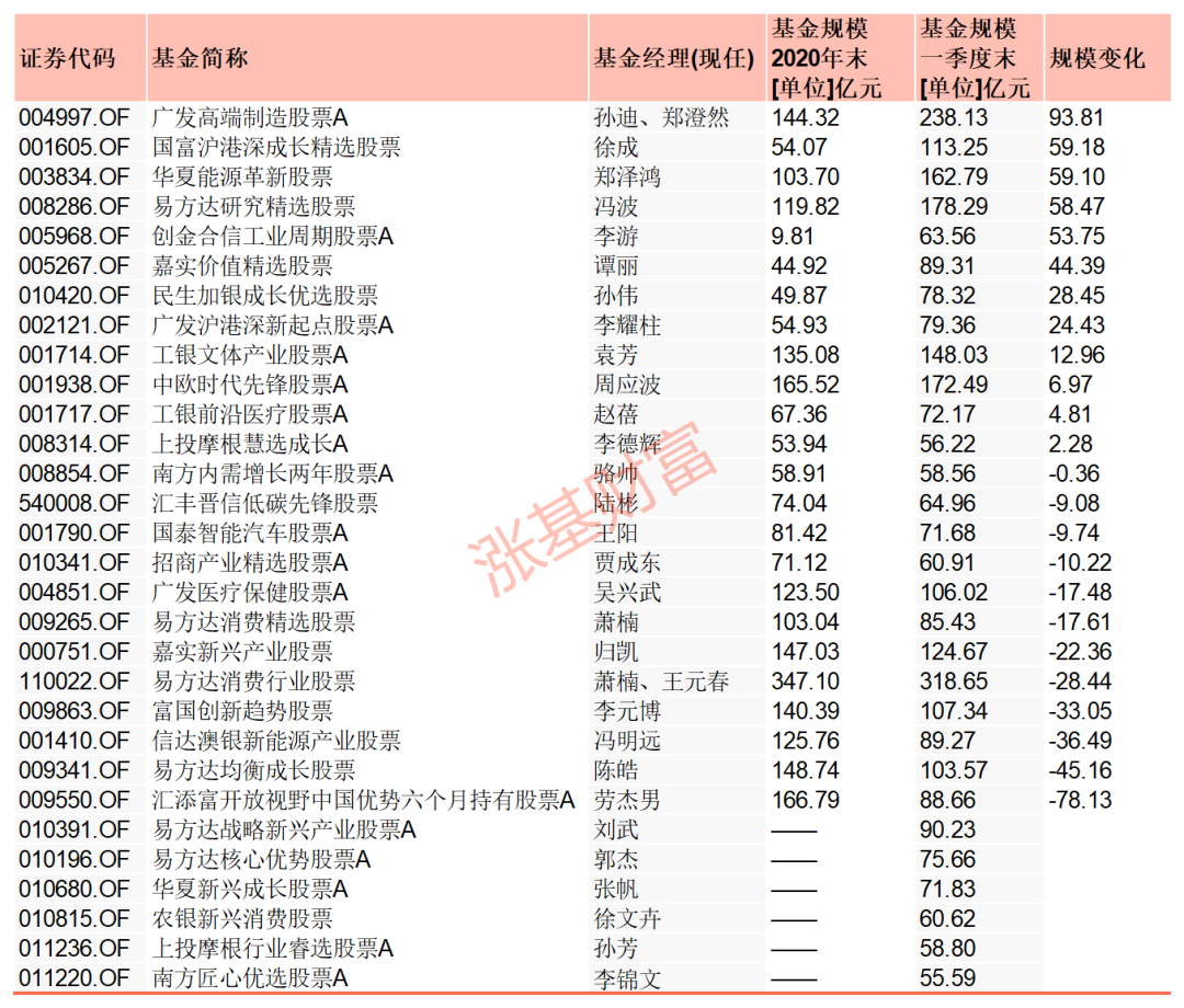 徐成管理的国富沪港深成长精选股票、郑泽鸿管理的华夏能源革新股票、冯波管理的易方达研究精选、李游管理的创金合信工业周期股票A单季度规模增长都超过了50亿,这几只股票型基金在一季度明显受到基民追捧。