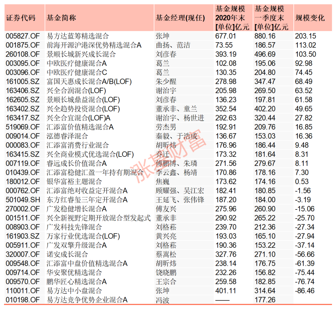 张坤管理的易方达中小盘混合、王宗合管理的鹏华匠心精选、饶晓鹏管理的华安聚优精选、胡昕炜管理的汇添富中盘价值精选、蔡嵩松管理的诺安成长等规模下降明显。