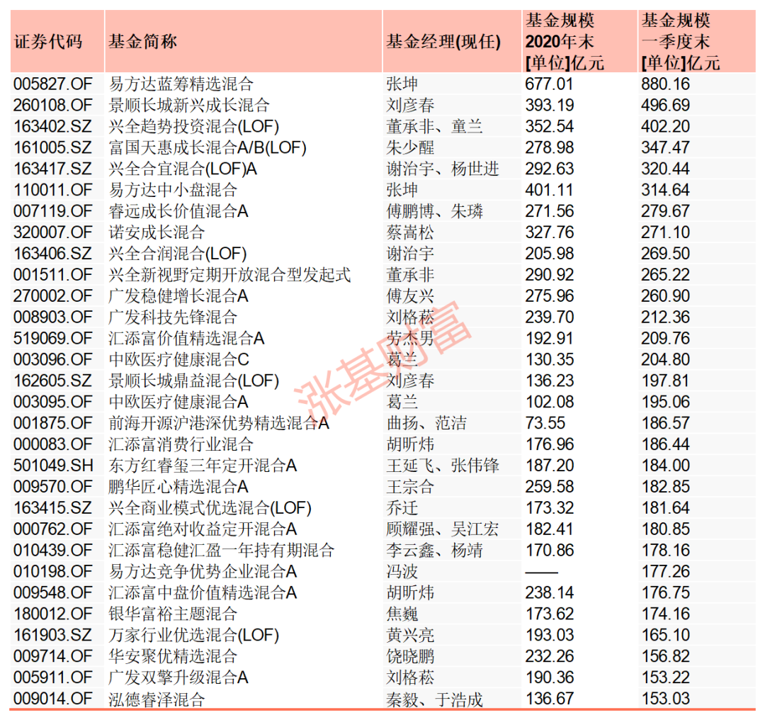 混合型基金中规模最大的还是张坤管理的易方达蓝筹精选,刘彦春管理的景顺长城新兴成长、董承非管理的兴全趋势投资混合、朱少醒管理的富国天惠成长、谢治宇管理的兴全合宜等也排名居前。