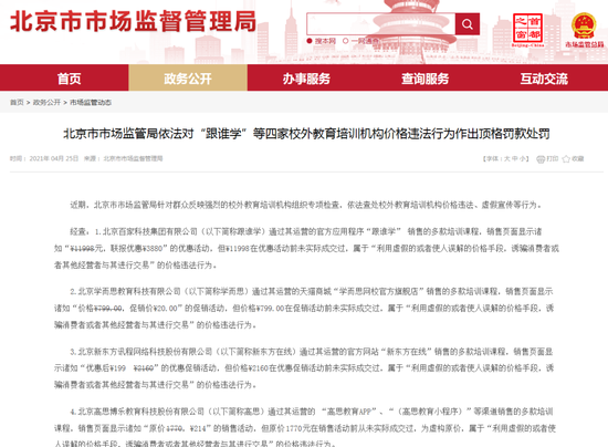 北京市市场监管局对跟谁学、学而思、新东方在线、高思四家校外教育培训机构上述价格违法行为分别给予警告和50万元顶格罚款的行政处罚。