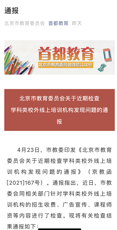 4月23日,北京市教委印发《北京市教育委员会关于近期检查学科类校外线上培训机构发现问题的通报》。《通报》指出,近日,市教委会同相关部门针对学科类校外线上培训机构的招生收费、广告宣传、课程师资等内容进行了检查,现将有关检查结果进行通报。