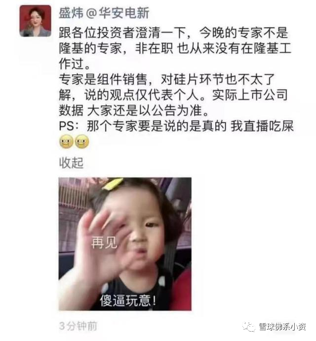 华安证券新能源分析师火速发朋友圈澄清:“参会的产业链专家并不是隆基股份的专家,也从来没有在隆基股份工作过。该名专家是组件销售环节的专家,对硅片环节不太了解。说的观点仅代表个人。实际上市公司数据以公告为准。”