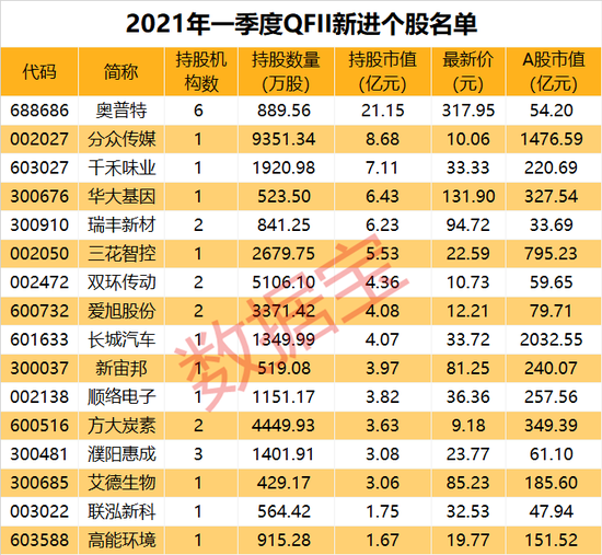 QFII新进个股中,奥普特获持仓市值最高,为21.15亿,远超第二位分众传媒的8.68亿。公司主营机器视觉设备核心软硬零部件的研发、生产和销售,是国产机器视觉零部件龙头,同时也是苹果供应链厂商之一。4月22日盘后,奥普特发布今年一季度报告。报告显示,公司一季度实现净利润6244.06万,同比大幅增长251.55%。第二天该股股价即拉出涨停。龙头地位、业绩向好叠加前景广阔,让公司获得了包括摩根大通、高盛集团等6家QFII的青睐。