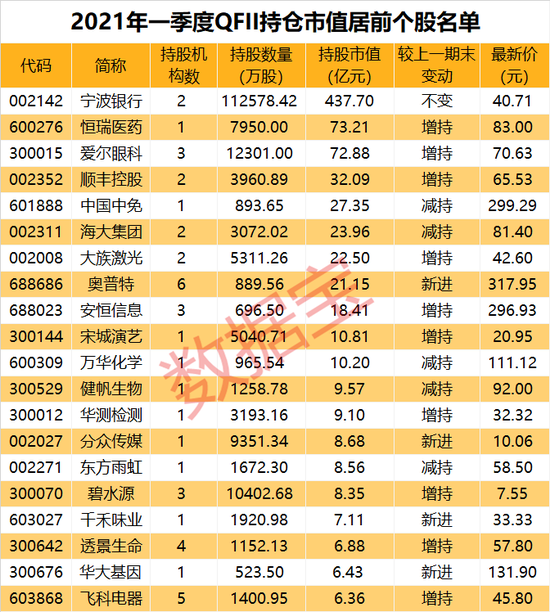 从持仓市值来看,获QFII持仓破百亿的个股仅一只,为宁波银行,最新持仓市值高达437.7亿。其他获QFII十亿以上持仓的个股还有10只,恒瑞医药、爱尔眼科、顺风控股、中国中免、海大集团、宋城演艺、万华化学等行业龙头股均在列。以上11股也是QFII抱团股,共获18家国际投资机构持仓。