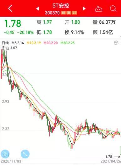 4月22日晚间,ST安控发布年报数据,由于公司2020年净利润亏损4.13亿元。同一时间,ST安控公告称,2018年、2019年和2020年最近三年净利润分别亏损5.51亿元、0.2亿元(调整后)和4.13亿元,同时债务逾期引发多起诉讼及仲裁案件,导致部分银行账户被冻结、多项资产抵押、公司及时任董事长被列为失信被执行人等原因,公司股票自2021年4月26日开市起被实施其他风险警示。