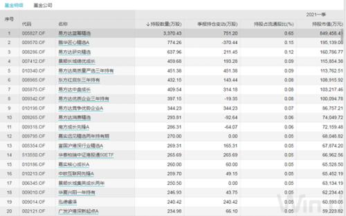 美团的高速发展被机构看好,也成为公募基金重仓持有的股票。2021年公募基金一季报显示,有201只基金重仓美团,合计持有市值445亿元,为公募基金重仓股持有市值第14大个股。公募基金重仓持有美团最多的20只基金: