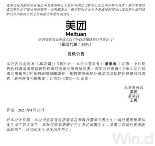 4月26日傍晚,美团公告称,收到国家市场监管总局通知书,公司将积极配合监管部门调查。目前公司业务一起正常。