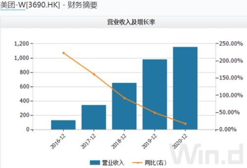 近年美团发展迅猛。Wind数据显示,2015年美团收入40亿元,到2016年已经有129.88亿元,涨幅223.17%,到2020年收入规模已经破千亿元。并且在获取收入的同时美团没有虚胖,而是实现了毛利润的快速增长,毛利润从2016年的59亿元增长至2020年的341亿元。