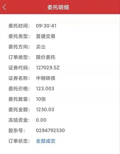 一位上周没有及时卖出中钢转债的网友,设置了一个冲高回落卖出的条件单,设置为高于129元,回落1元卖出,卖出价格为及时买三价。结果,9点半后,以123.003元卖出,每签盈利230.03元。