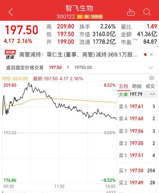 4月26日,智飞生物实控人蒋仁生及其一致行动人蒋喜生,分别减持1641.1万股与100万股,减持比例分别为1.03%和0.06%,合计为1.09%。当天智飞生物的均价为203元,以此计算,减持金额分别为33.31亿元和2.03亿元。