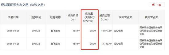 值得注意的是,4月26日智飞生物的成交量为2037.6万股,成交额41.4亿元。实控人当天减持的数量,相当于当天成交量的80%,当然公告称减持是通过大宗交易进行。