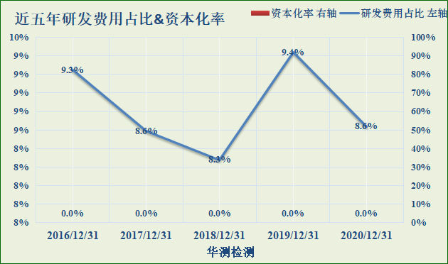 华测检测始终维持较高的研发投入,近五年研发费用率维持在8%之上。且无研发费用资本化。