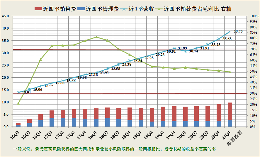 投资者可关注近四季销售和管理费用与毛利润之比持续小于30%的公司(绿线低于下红线为优异,靠近为优秀),具备较高的竞争优势,若30-70%之间为可接受区域(图中红色直线之间),若大于70%需要警惕,说明该公司产生净利润的能力较弱。