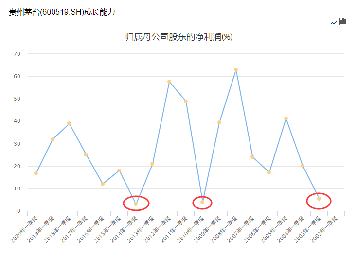 比与2020年的16.69%和2019年的32%,贵州茅台这个一季报盈利增速可以用失速两个字来形容。而且从历史来看,此前贵州茅台只有三年的一季度业绩增速低过10%,分别是2003年、2010年2014年。