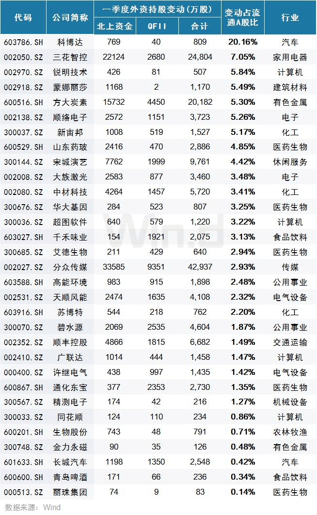 除被QFII重仓外,部分个股在一季度期间也被北上资金盯上。