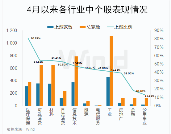从行业上看, Wind一级行业中,4月份医疗保健行业个股上涨比例最高,行业中382家上市公司,有309家上涨,占比高达80.89%。紧随其后可选消费、材料和日常消费三大行业也不错,行业中个股上涨比例均超过50%。而公用事业、金融等因前期表现较强,4月份普遍出现回调,行业中个股上涨比例都不到20%。