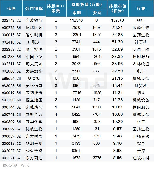 从持仓市值看, 15股获QFII持仓超过10亿元,持仓市值最大的是宁波银行,一季度末QFII持有宁波银行约11.26亿股,总持仓市值高达437.7亿元。此外,恒瑞医药、爱尔眼科持仓市值均在70亿元以上,持仓市值较大的还有广联达、顺丰控股、中国中免、海大集团、大族激光、奥普特等。