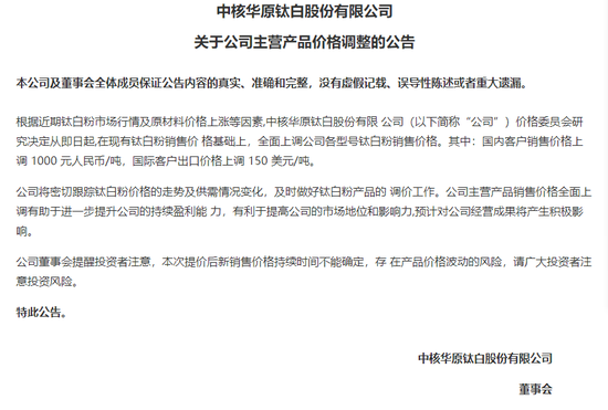 今年4月以来,中核钛白、惠云钛业、金浦钛业等多家钛白粉上市公司“组团”发布涨价函,价格调涨1000至1500元/吨。