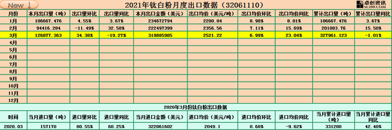 从最新发布的海关数据来看,3月份钛白粉出口均价已超过2500美元/吨,该价格下出口的钛白粉多为春节前企业从海关出货的订单,而今年4月份外贸执行的订单,硫酸法钛白粉出口价格高于3100美元/吨。田晓雨表示,当前钛白粉市场的外需表现稳中有升,出口市场向好。短期来看,国内钛白粉市场处于紧平衡状态;长期来看,供应面可能会出现宽松情况,因部分企业下半年可能有产能扩充计划。